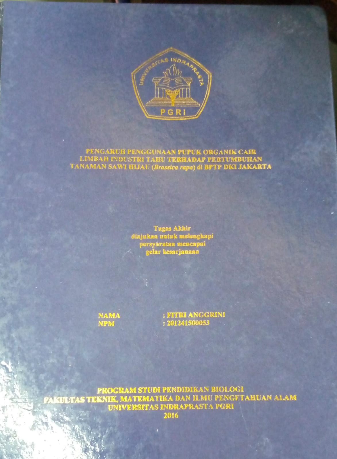 $a Penulis memanjatkan puji syukur kehadirat Tuhan Yang Maha Esa yang telah melimpahkan rahmat dan karunia-Nya kepada penulis, sehingga akhirnya penulis dapat menyelesaikan skripsi ini tepat pada waktunya. Skripsi yang berjudul "Pengaruh Penggunaan Pupuk Organik Cair Limbah Industri Tahu Terhadap Pertumbuhan Tanaman Sawi Hijau (Brassica rapa) di BPTP DKI Jakarta ini ditulis untuk memenuhi salah satu syarat guna. memperoleh gelar sarjana pada Universtas Indraprasta PGRI Pada kesempatan yang baik ini, izinkanlah penulis menyampaikan rasa hormat dan ucapan terima kasih kepada semua pihak yang dengan tulus ikhlas telah memberikan semangat, bantuan serta dorongan kepada penulis dalam menyelesaikan skripsi ini, terutama kepada: 1. Zakiah Fithah Aini, M.Pd selaku Dosen Pembimbing Materi Universitas Indraprasta PGRI 2. Endang Suhendar, MT selaku Dosen Pembimbing Teknik Universitas Indraprasta PGRI 3. Prof. Dr. H. Sumaryoto selaku Rektor Universitas Indraprasta PGRI 4. Dr. H. Supardi US selaku dekan FTMIPA Universitas Indraprasta PGRI 5. Dra. Yulistiana, M. Pd selaku Ketua Program Studi Pendidikan Biologi. 6. Dra. Netty D.H. Sitanggang, M.Si selaku Sekretaris Program Studi Pendidikan Biologi. 7. Dr. Yudi Sastro selaku Kasie KSPP BPTP Jakarta. 8. Ibu Nofi Anisa selaku peneliti yang telah membimbing dan membantu selama proses penelitan di BPTP Jakarta. 9. Segenap Staf dan karyawan BPTP Jakarta yang telah membimbing dan membantu selama proses penelitian di BPTP Jakarta. 10. Segenap Staf Pengajar Program Studi Pendidikan Biologi yang telah membimbing dan membantu selama proses perkuliahan di Universitas Indraprasta PGRI serta segenap Staf Sekretariat FIMIPA yang telah membantu dalam hal surat-menyurat dan perizinan.