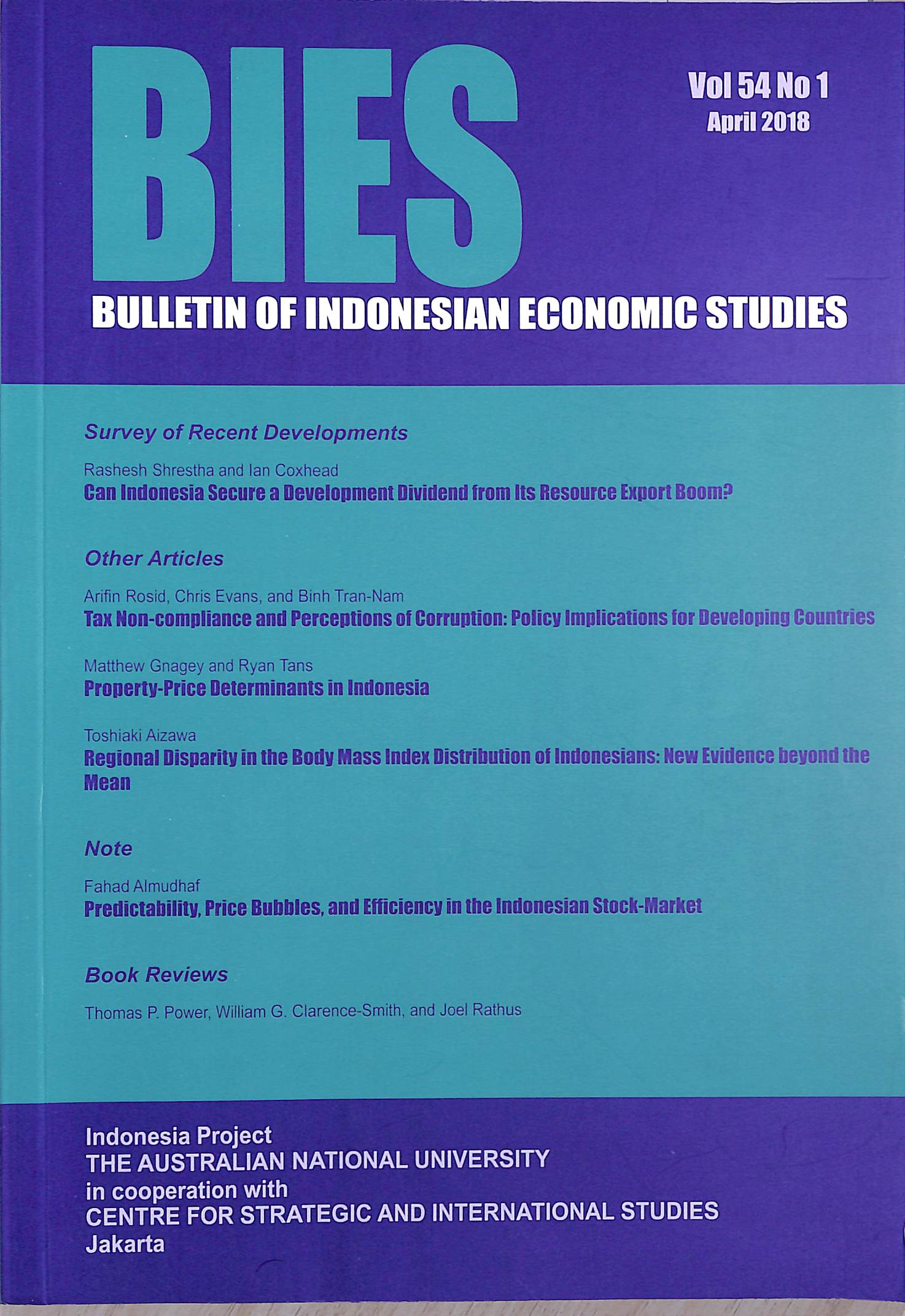 | Catatan | Survey of Recent Developments 1.) Can Indonesia Secure a Development Dividend from Its Resource Export Boom?. Rashesh Shrestha, Ian Coxhead. Other Articles 1.) Tax Non-Compliance and Perceptiona of Corruption: Policy Implications for Developing Countries. Arifin Rosid, Chris Evans, Binh Tran-Nam. 2.) Property-Price Determinants in Indonesia. Matthew Gnagey, Ryan Tans. 3.) Regional Disparity in the Body Mass Index Distribution of Indonesians: New Evidence beyond the Mean. Toshiaki Aizawa. Note 1.) Predictability, Price Bubbles and Efficiency in the Indonesian Stock-Market. Fahad Almudhaf. |