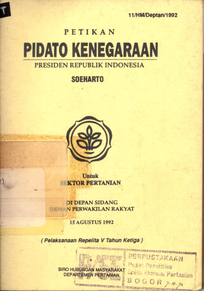 | Judul | Petikan pidato kenegaraan Presiden Republik Indonesia Soeharto : Untuk sektor pertanian di depan sidang Dewan Perwakilan Rakyat 15 Agustus 1992: Pelaksanaan Repelita V tahun ketiga |