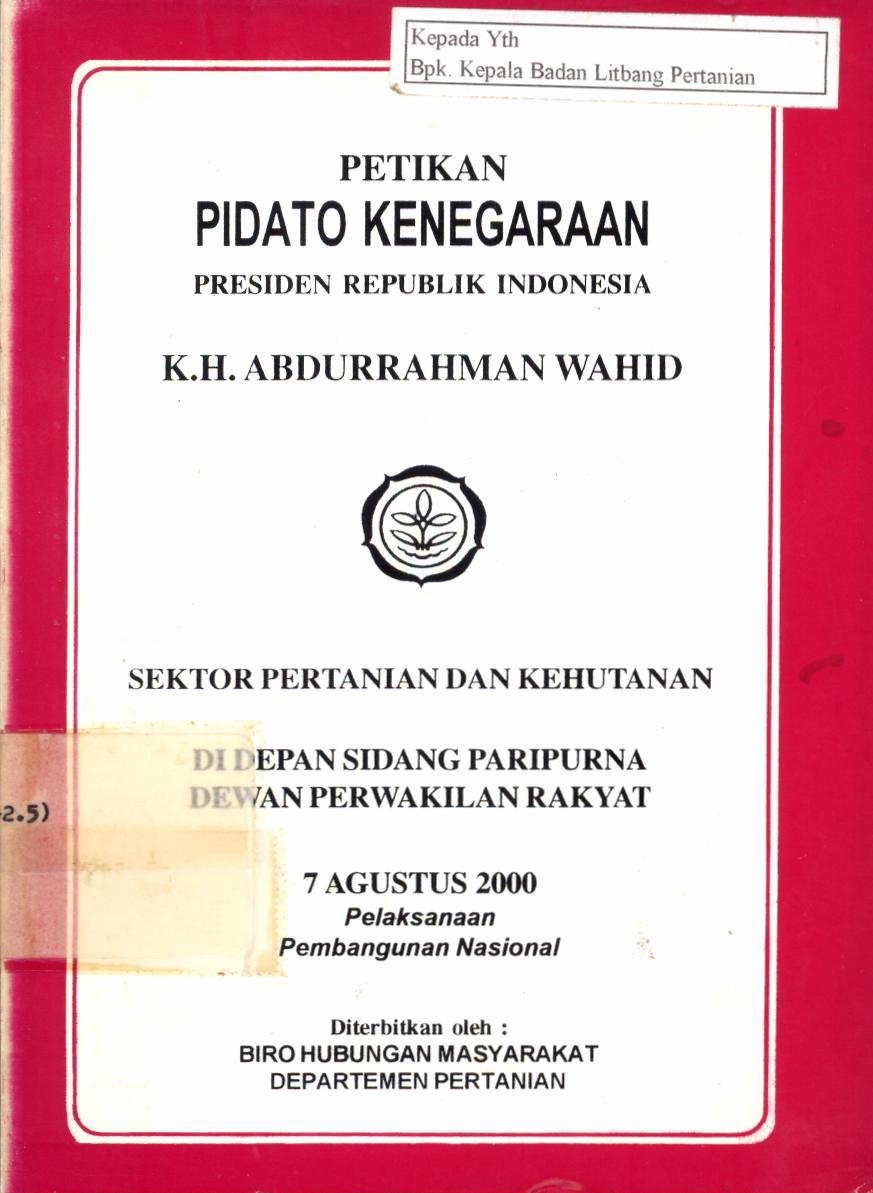 | Judul | Petikan Pidato Kenegaraan Presiden Republik Indonesia K.H. Abdurrahman Wahid : Sektor Pertanian dan Kehutanan di depan Sidang Paripurna DPR 7 Agustus 2000 |